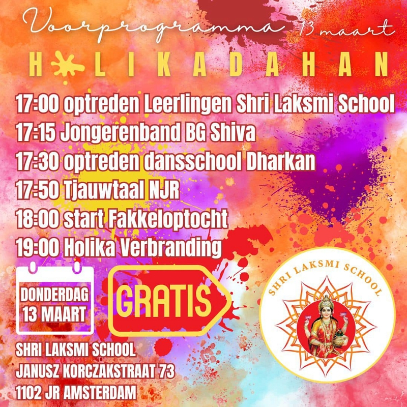 Holika Dahan herinnert ons aan het verhaal van Prahlad, een trouwe toegewijde van Shri Vishnu, die ondanks de plannen van zijn tante Holika ongedeerd uit het vuur kwam. Deze gebeurtenis benadrukt de kracht van waarheid, liefde en dharma. De viering begint op school met een feestelijk programma vol muziek, optredens en culturele bijdragen. Daarna lopen we gezamenlijk in een fakkeloptocht naar het Bijlmer Parktheater, waar de traditionele Holika-verbranding plaatsvindt.